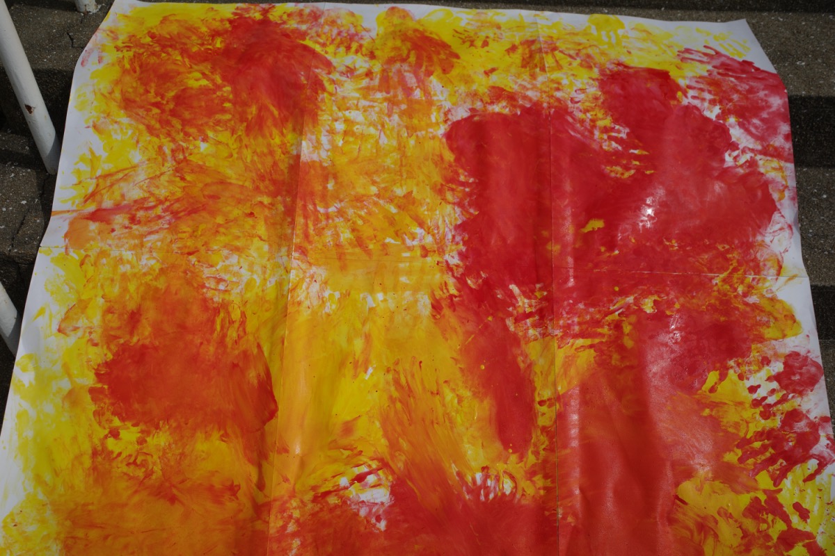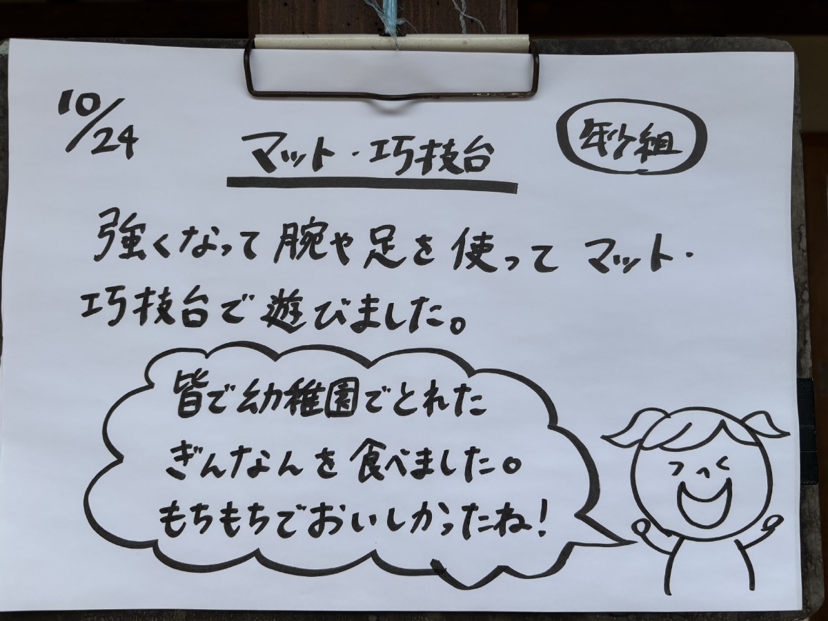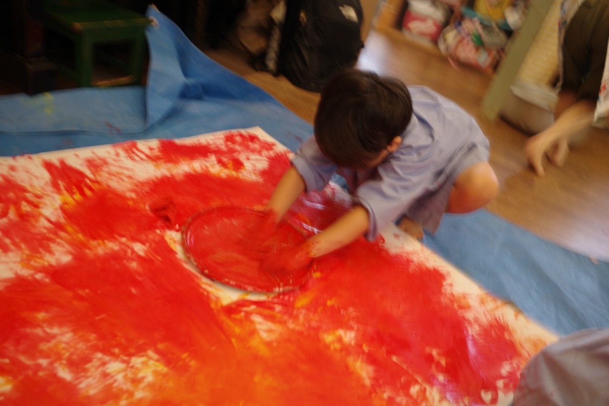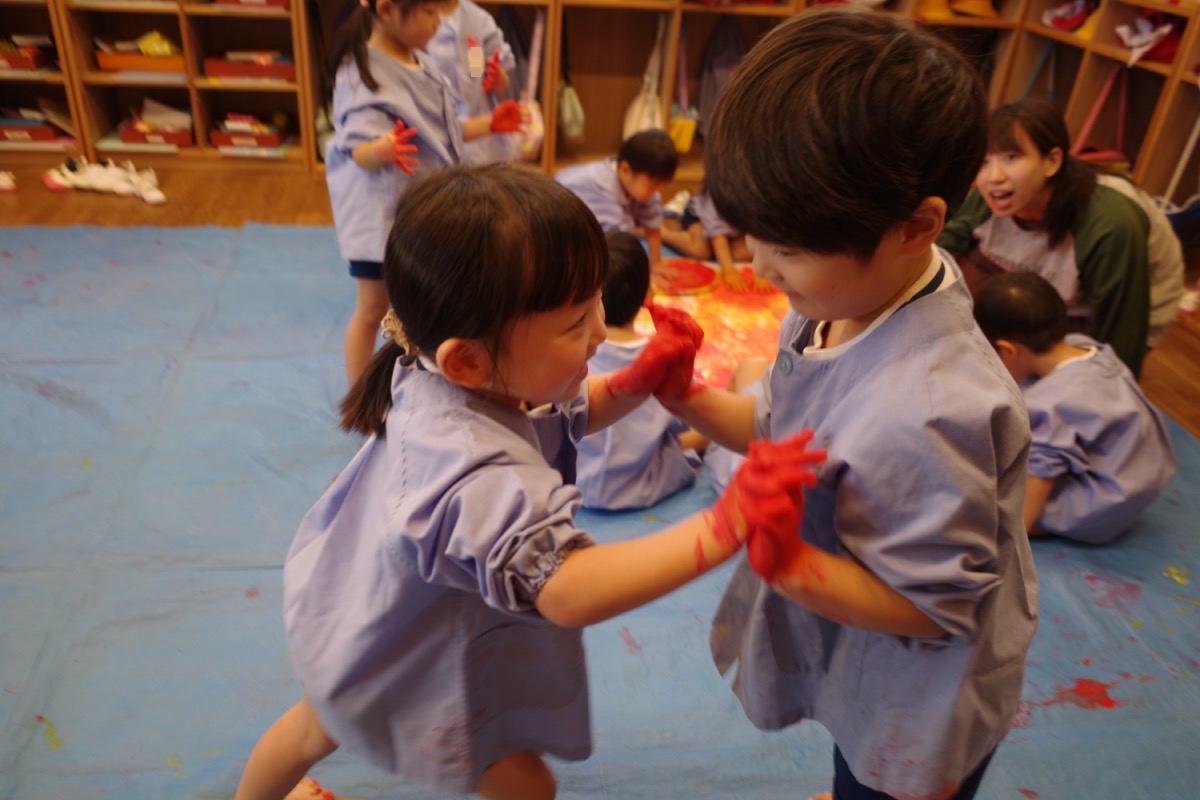 年中は色を混ぜたらどうなるか?絵本を読んでやってみたり、縄編みをやってみたり。年長さんは舞台セットを単色で塗ったり、掛け合いの歌を歌ってみたり。年少さんはマットで。バラ組さんは片栗粉を溶いて、ボタンみたいなものを浮かべて掬ってみたり。園庭の銀杏も煎っていただきました(一部クラス)