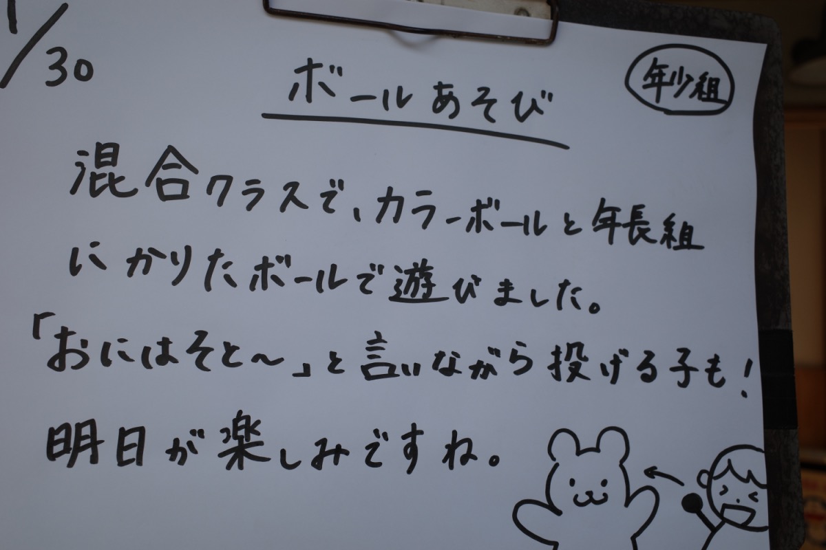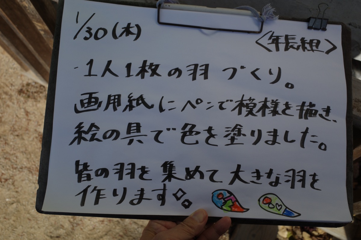 空から何が落ちてくるのかな? 01/30/2025 最終更新日時 : 01/30/2025 ozasa-admin [Show slideshow] 1 2 ► 年長は何やら羽のようなものを制作。年中の折り紙は鬼さんかな。バラ組はリトミック。年少は、ボール遊び。昨日の絵本かりの様子もUP。いよいよ明日は、何かがやってくる?! \ 最新情報をチェック / FacebookXBlueskyHatenaCopy
