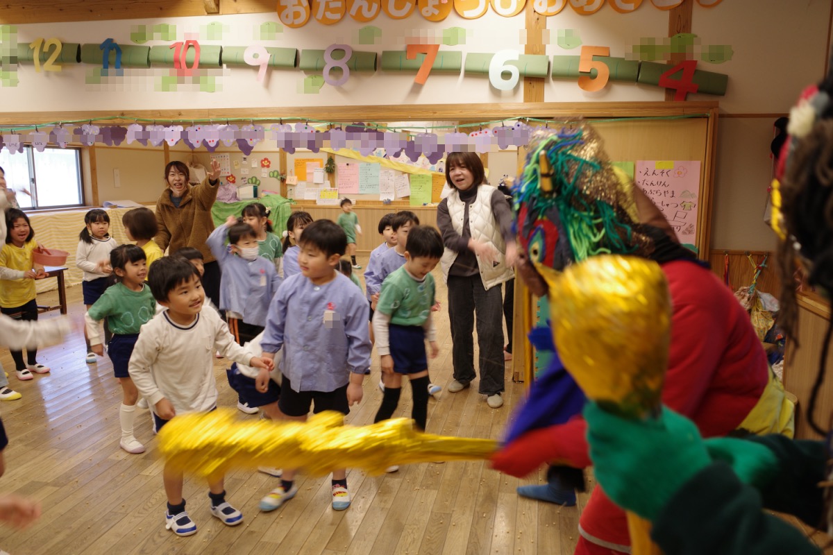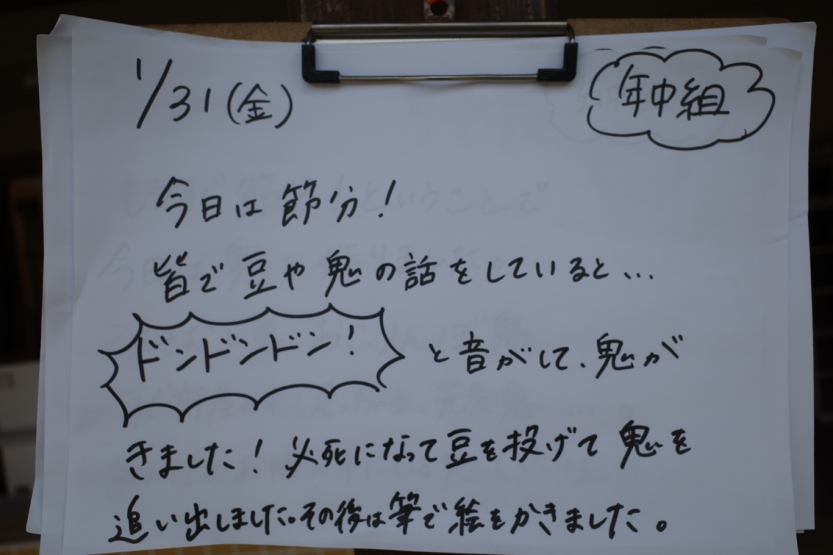 おにがきた。(写真多数) 01/31/2025 最終更新日時 : 01/31/2025 ozasa-admin [Show slideshow] 1 2 3 ► 幼稚園に、鬼さんがやってきました。結構元気な鬼たちに、びっくりしたり、涙ぐむ子もいたけど、みんなで「鬼はそと!」で教室から追い出しました。終わって鬼とみんなでやっつけた絵を描きました。年中は墨をつかって。お友達や投げてる豆(新聞紙を丸めたものもあったけど)まで絵の描い。年長は鬼に捕まりかけた先生を助けたり。バラ組さんは、先生の腕の先の優しい鬼で、鬼はそと。 \ 最新情報をチェック / FacebookXBlueskyHatenaLINECopy