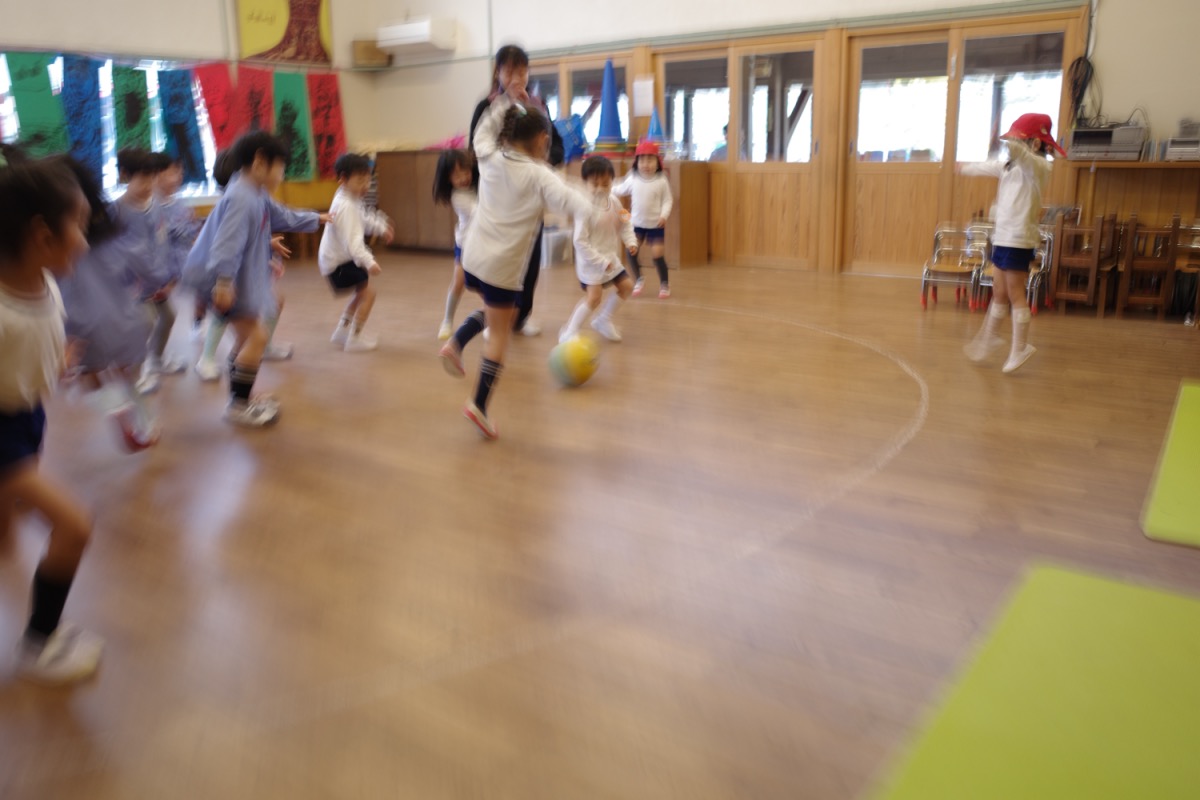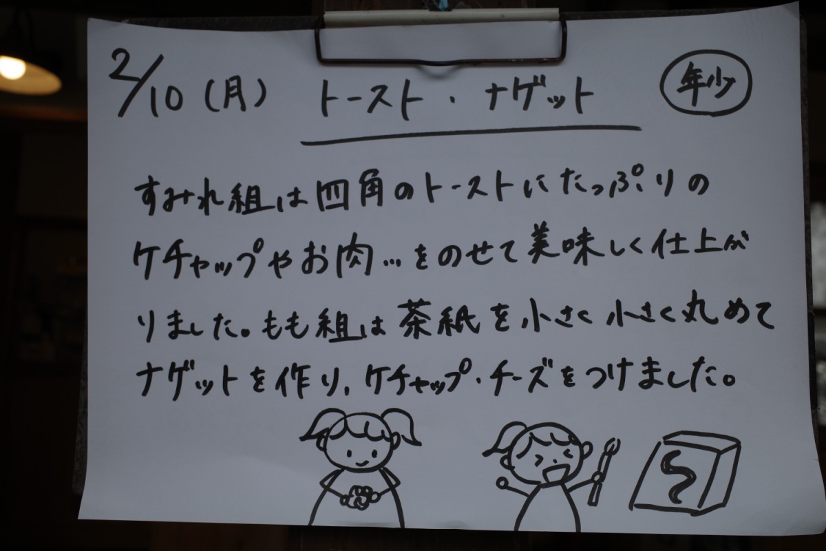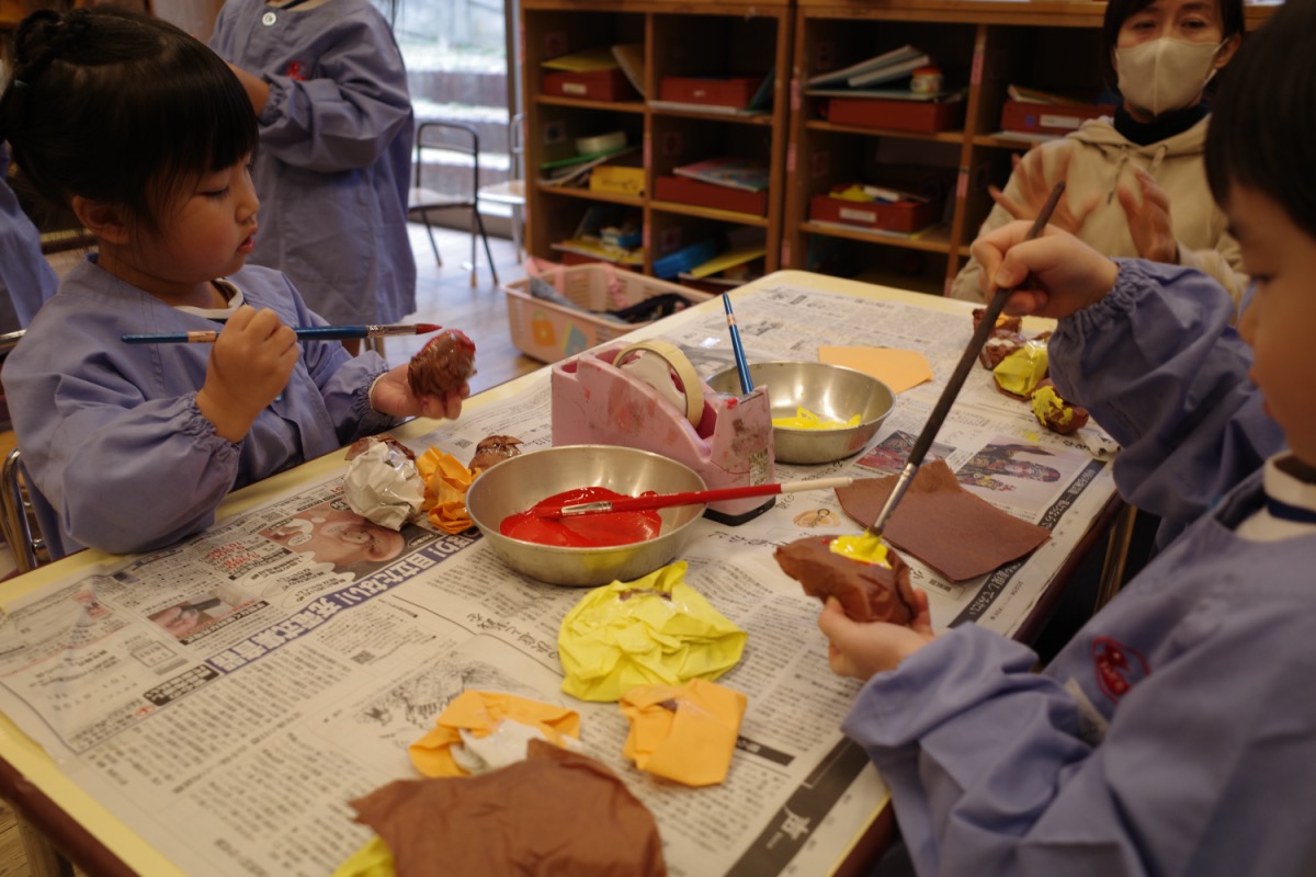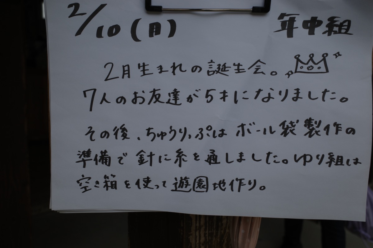 今日は2月の誕生会、年少さんは、発表会での年長さんの楽器演奏を見て私たちも。年長さんは幼稚園でも思い出を話しているうちに楽器演奏をもう一度やりたいと。缶蹴りをして遊んだりも。バラ組さんも楽器当てクイズ。年中さんは糸通しに挑戦。年少さんはお店屋さんのパンやナゲットに色づけ。ついでに自分の手も色づけ。