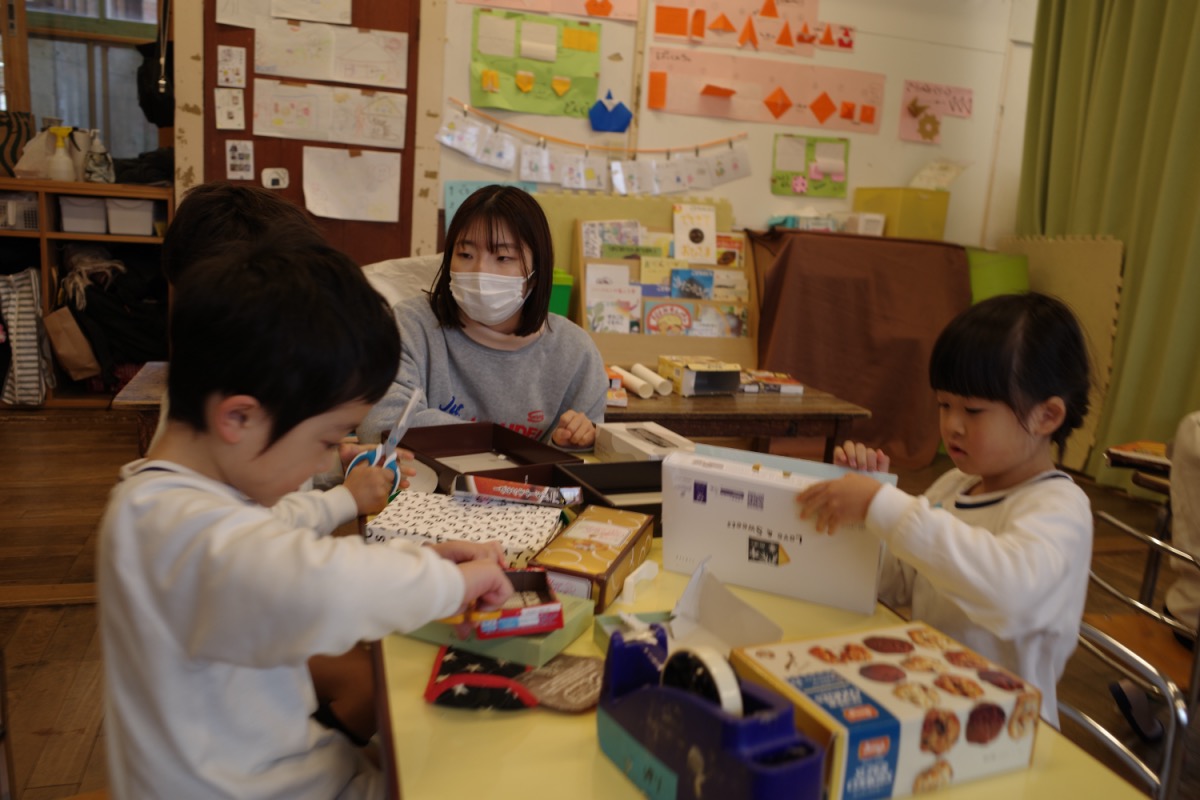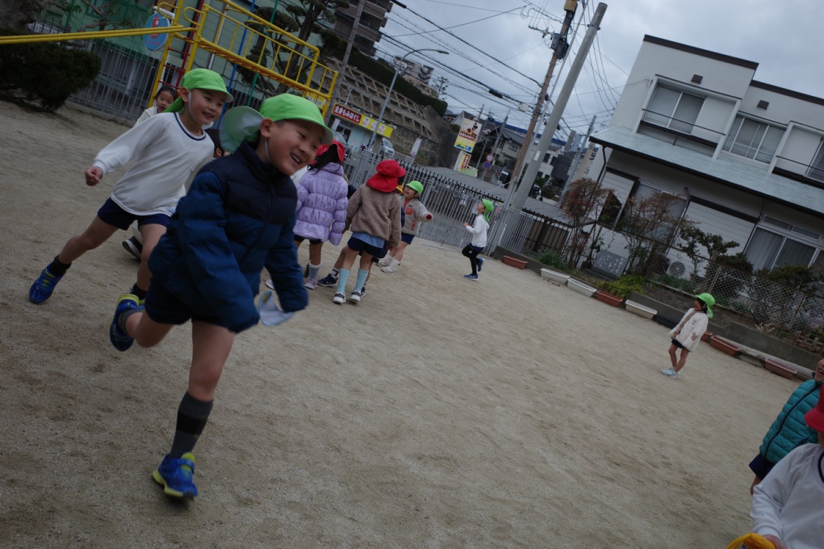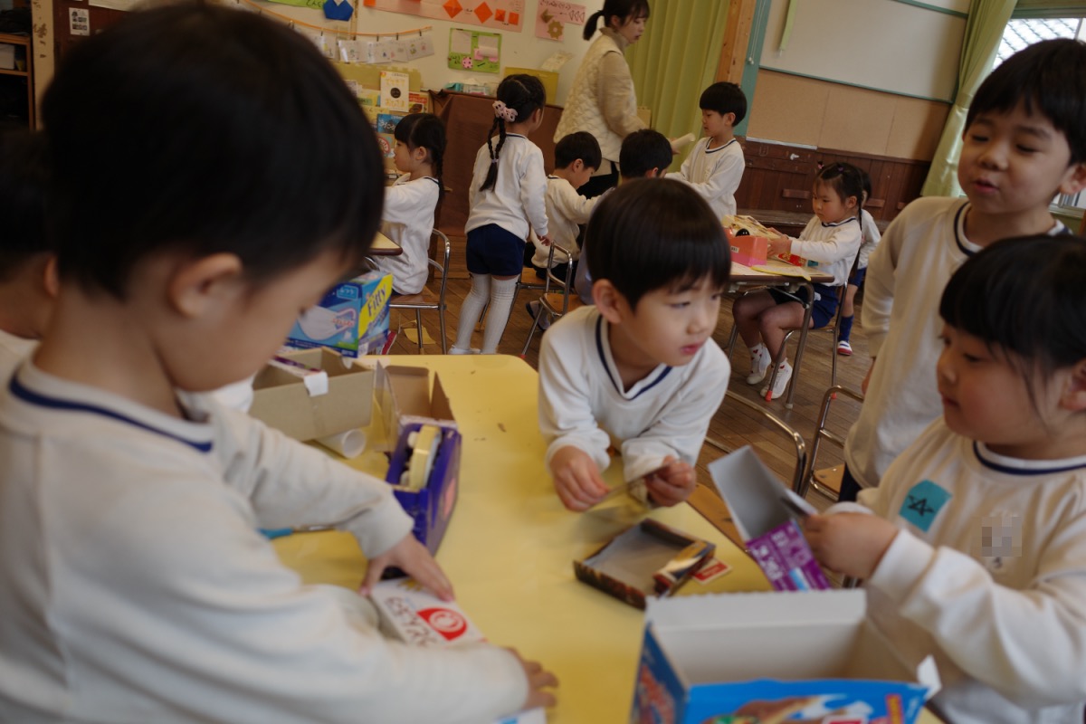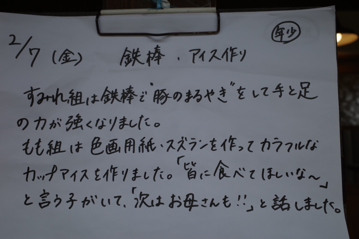 今日は2月の誕生会、年少さんは、発表会での年長さんの楽器演奏を見て私たちも。年長さんは幼稚園でも思い出を話しているうちに楽器演奏をもう一度やりたいと。缶蹴りをして遊んだりも。バラ組さんも楽器当てクイズ。年中さんは糸通しに挑戦。年少さんはお店屋さんのパンやナゲットに色づけ。ついでに自分の手も色づけ。