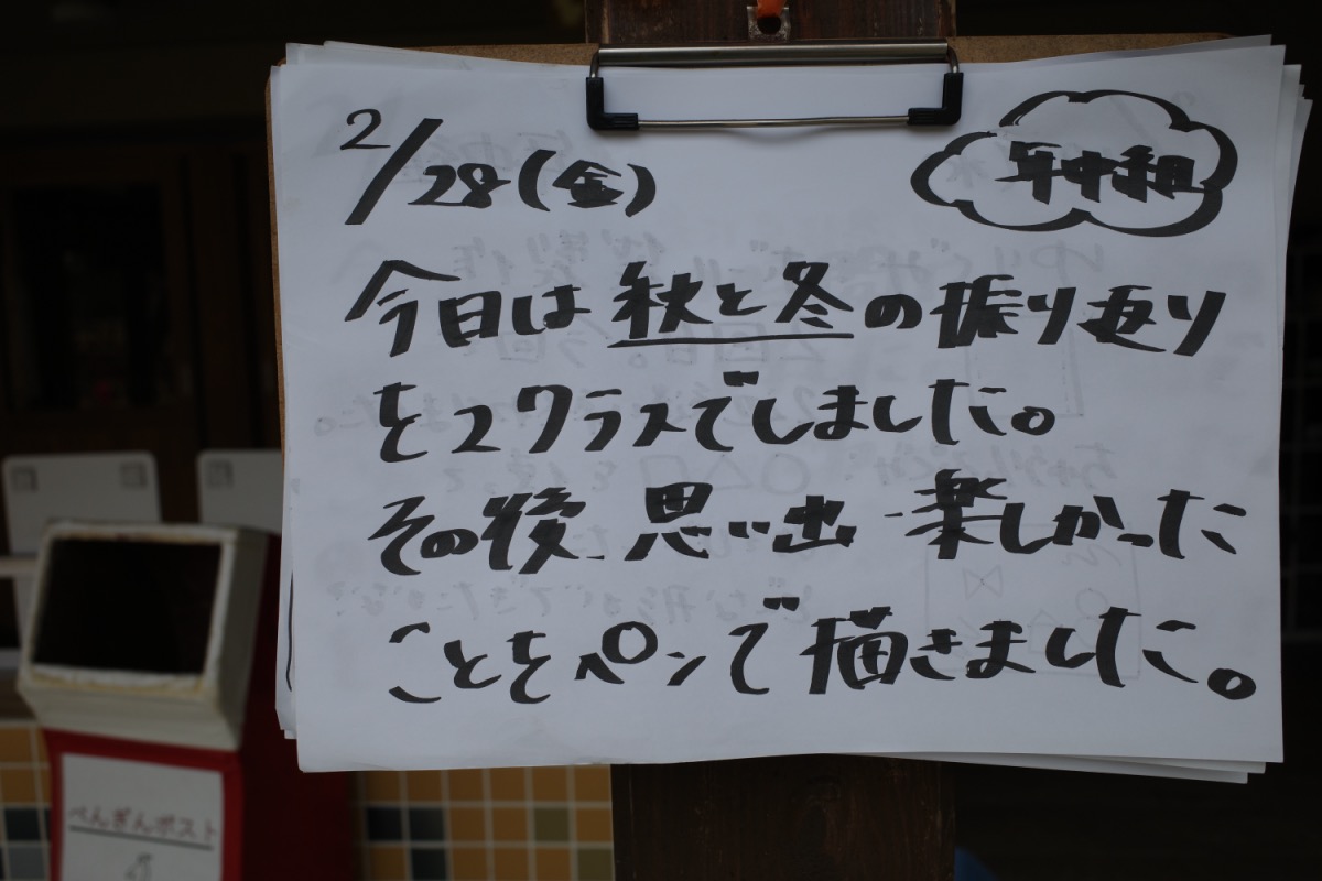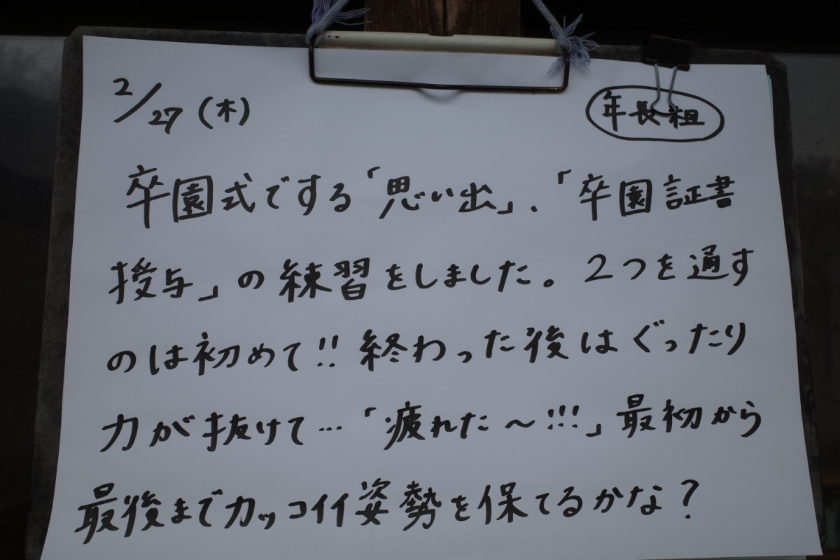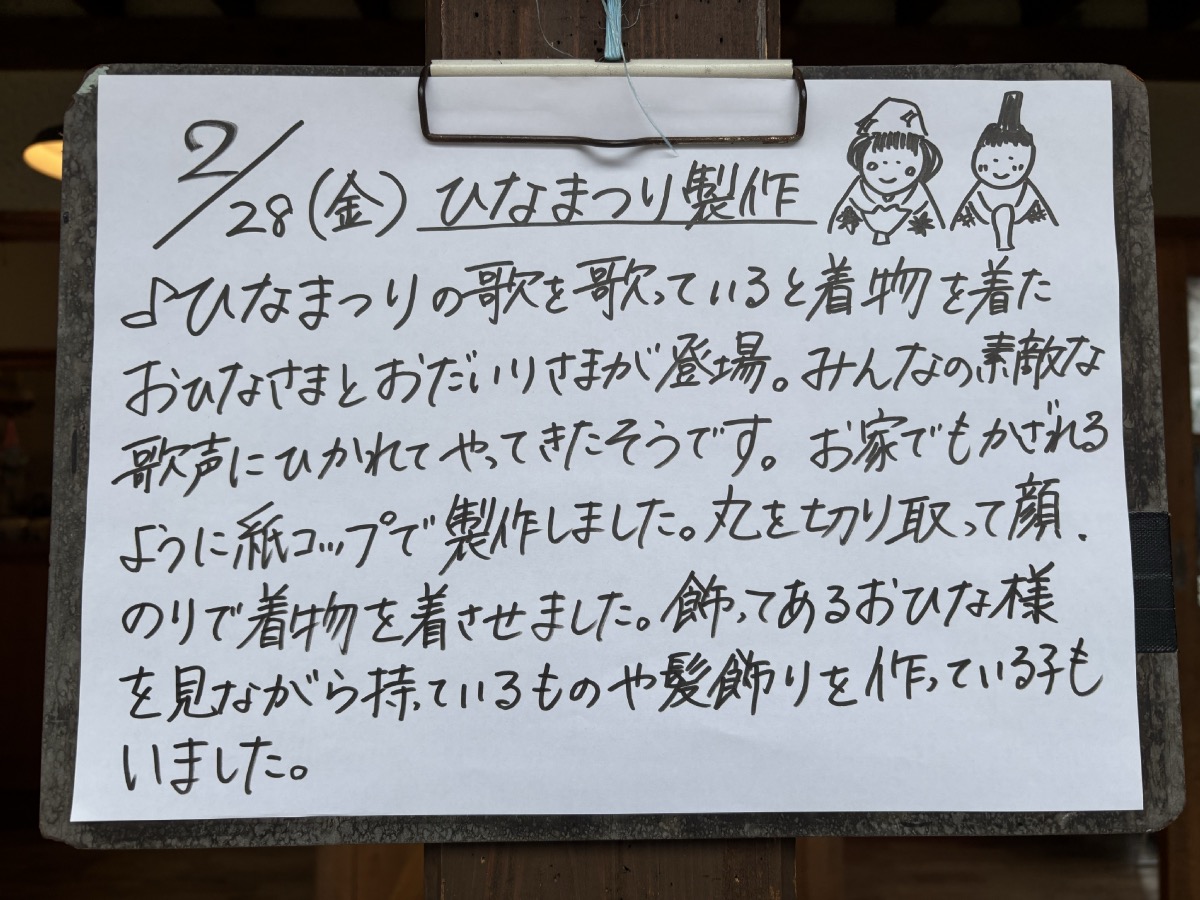 お雛祭り間近 02/28/2025 最終更新日時 : 02/28/2025 ozasa-admin [Show slideshow] 1 2 ► 年少さんはお雛様を作りました。年長さんは卒園式の練習を少しづつ繰り返す中で、また今までと少し違った姿を見せてくれます。年度末が近づき、いろいろな楽しかったことを思い返したりしています。雨は降らなかったので、皆そとでのびのびと \ 最新情報をチェック / FacebookXBlueskyHatenaCopy