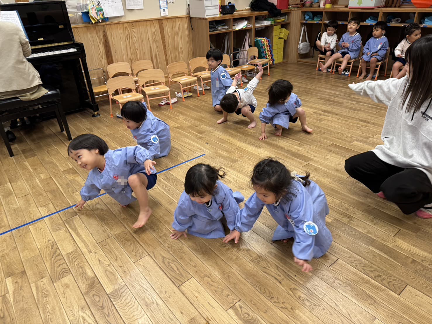霧雨が降ったりで、思うようにそとでは遊べませんでしたが、お部屋で、何やら作ったり、卒園式の練習をしたり、上の学年の教室に行って遊んだりの一日でした。バラ組さんhあ、昨日あひる歩きをしたり。(転入希望の方やひよこ組希望の方、一時帰国で遊びに来たお友達などの案内ですこし忙しめ写真少なめ)