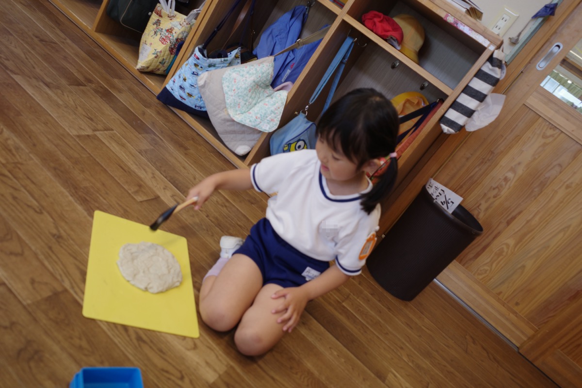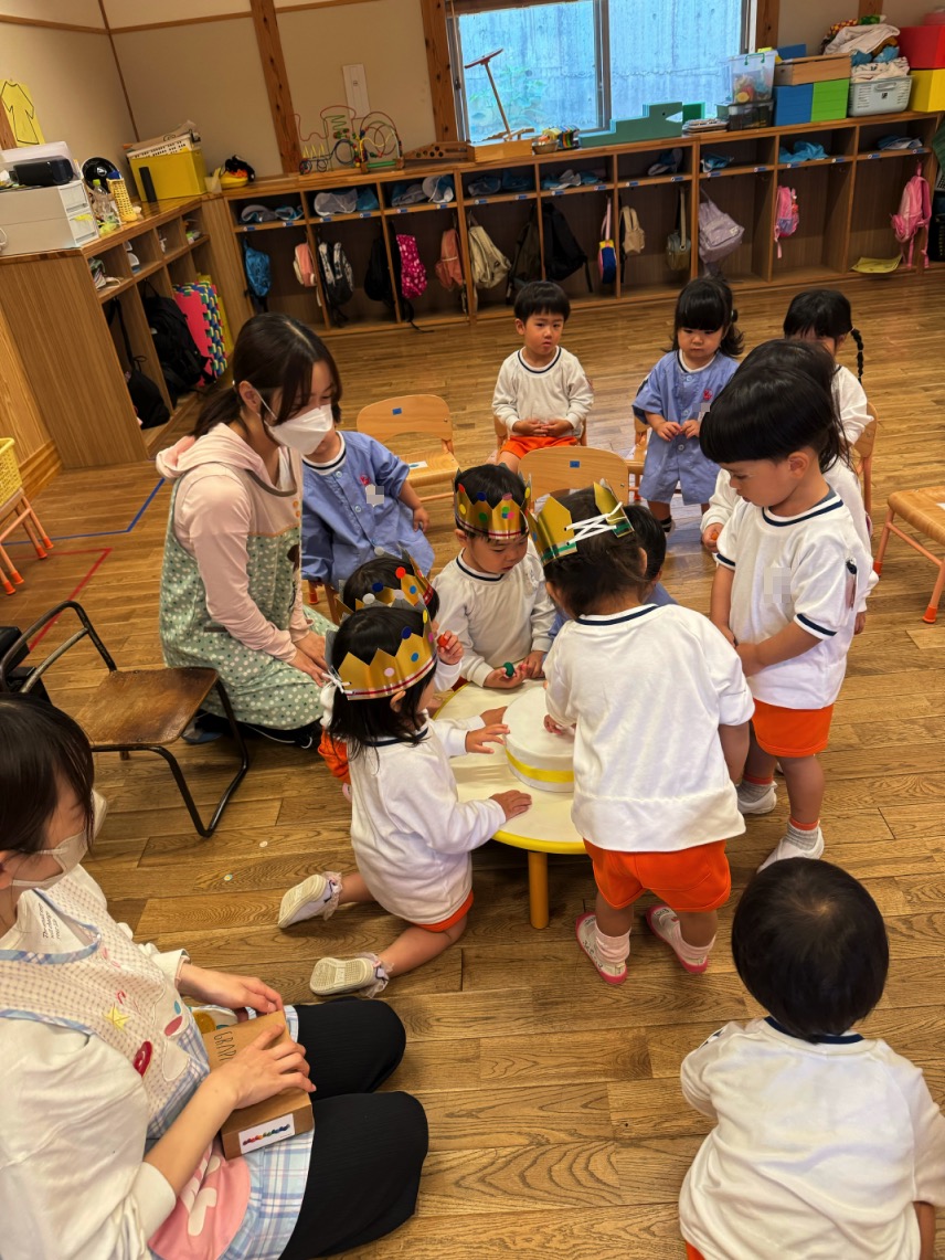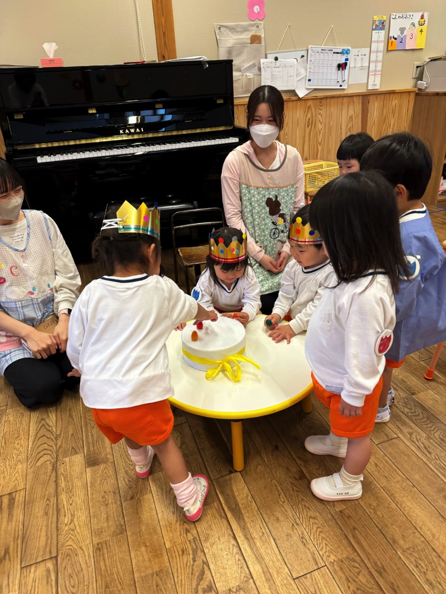 今日は4・5月のお誕生会。年長さんは親子で竹馬だったり、ホールで跳び箱に挑戦。年中さんは絵を描いたり、金槌遊び。年少さんは畑の水やりやダンゴムシを探したり。年少少さんは、今日も上の園庭で砂場や滑り台や小さなお家で遊びました。お母さん達は、えほんの部屋で絵本のメンテナンスのお手伝いをしていただきました。ありがとうございます。(一冊一冊ページをめくっていたんでないか確認)