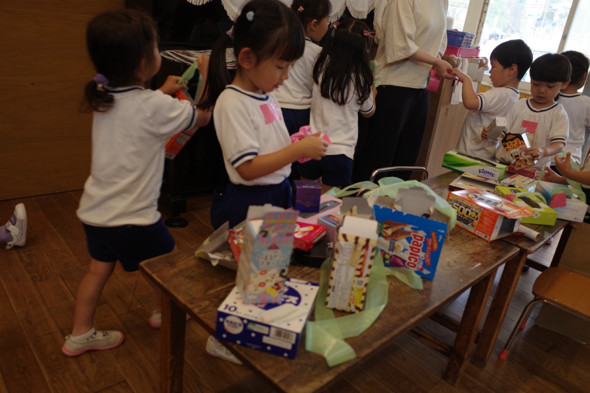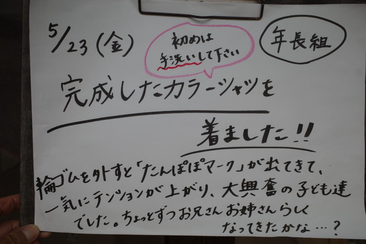 カラーシャツできた! 05/23/2025 最終更新日時 : 05/23/2025 ozasa-admin [Show slideshow] 1 2 3 ► 待望のカラーシャツが出来たたんぽぽ組。輪ゴムを外すとキレイな絞り染めが。その後、みんなにシャツを見せで、たんぽぽ団の歌も披露していました。年少さんhあシャボン玉遊びをして、まあるい絵を描きました。年中さんはフルーツバスケット。年少少さんも今日もいろいろ。 \ 最新情報をチェック / FacebookXBlueskyHatenaCopy