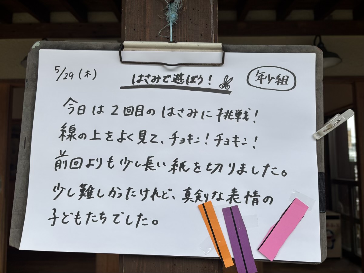 5/29:ハサミをつかったり、ノリを使ったり、ヤスリをかけたり 05/30/2025 最終更新日時 : 05/30/2025 ozasa-admin [Show slideshow] 年長は秘密基地にはまってます。年中はさすりがけに挑戦。年少はハサミを使った制作に今日も。 \ 最新情報をチェック / FacebookXBlueskyHatenaCopy