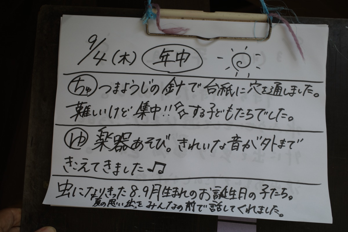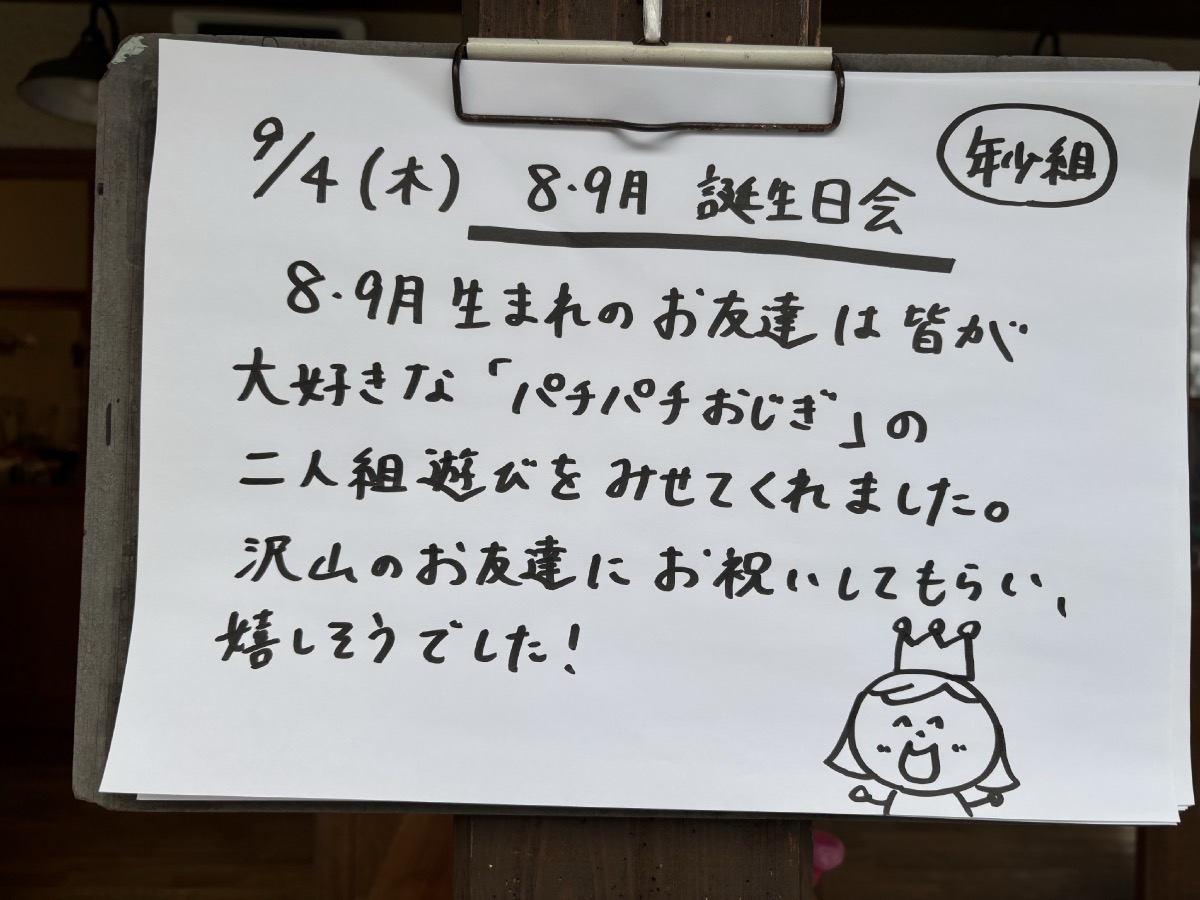 今日はお誕生会 09/04/2025 最終更新日時 : 09/04/2025 ozasa-admin [Show slideshow] 今日は8,9月のお誕生会。小笹幼稚園オリジナルの冠を被って、お祝いしてもらいました。ひよこ組(親子教室)は、ヤマゴボウ(紫の実がなる)で色水遊び。 本日も見学の方がいたので、写真少なめ。 \ 最新情報をチェック / FacebookXBlueskyHatenaCopy