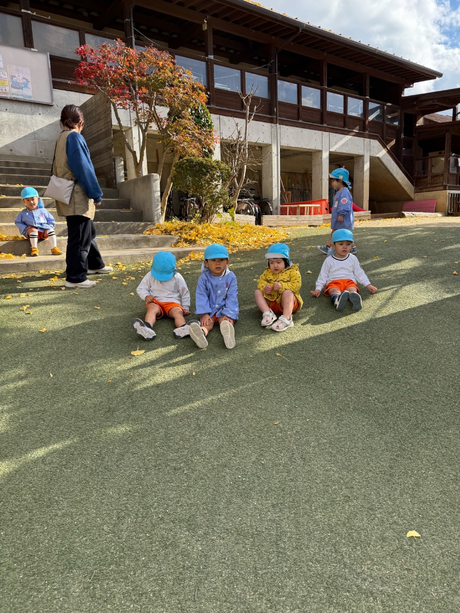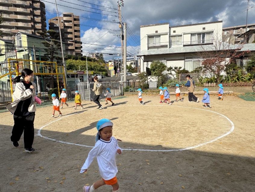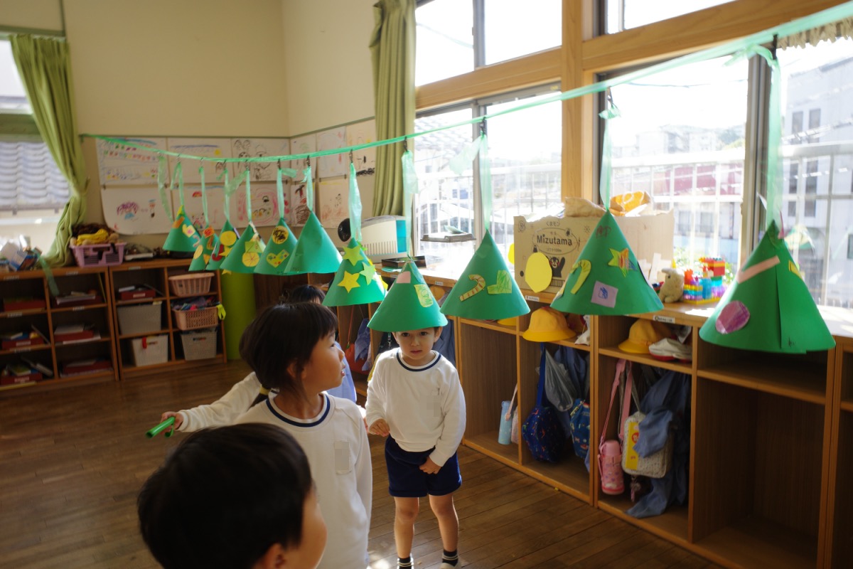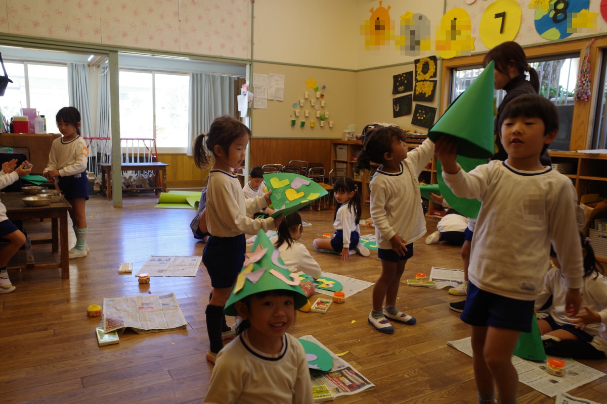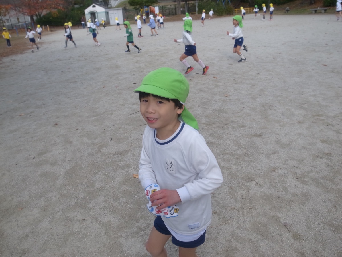 しばらくぶりに、皆でマラソン、ばら組さんは、園庭を走りました。年少さんは、お父さんお母さんといっしょに遊んだりお昼を食べたり。保護者の方はその後、グループに別れいろいろお話ししました。年中さんはクリスマスツリー作り。中には、帽子がわりに被る子も。年長さんは北公園まで遊びに行きました。のびのび!!