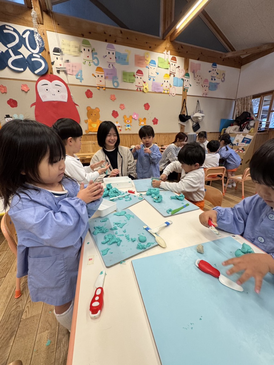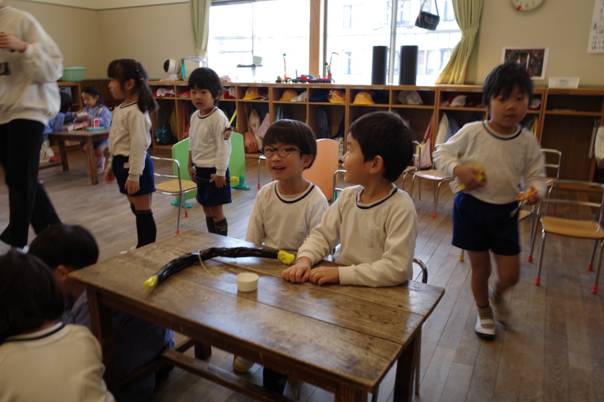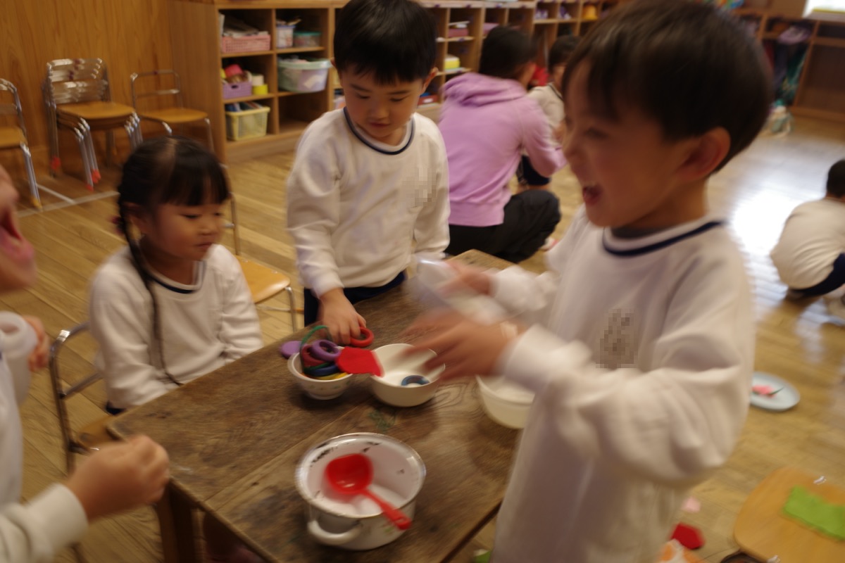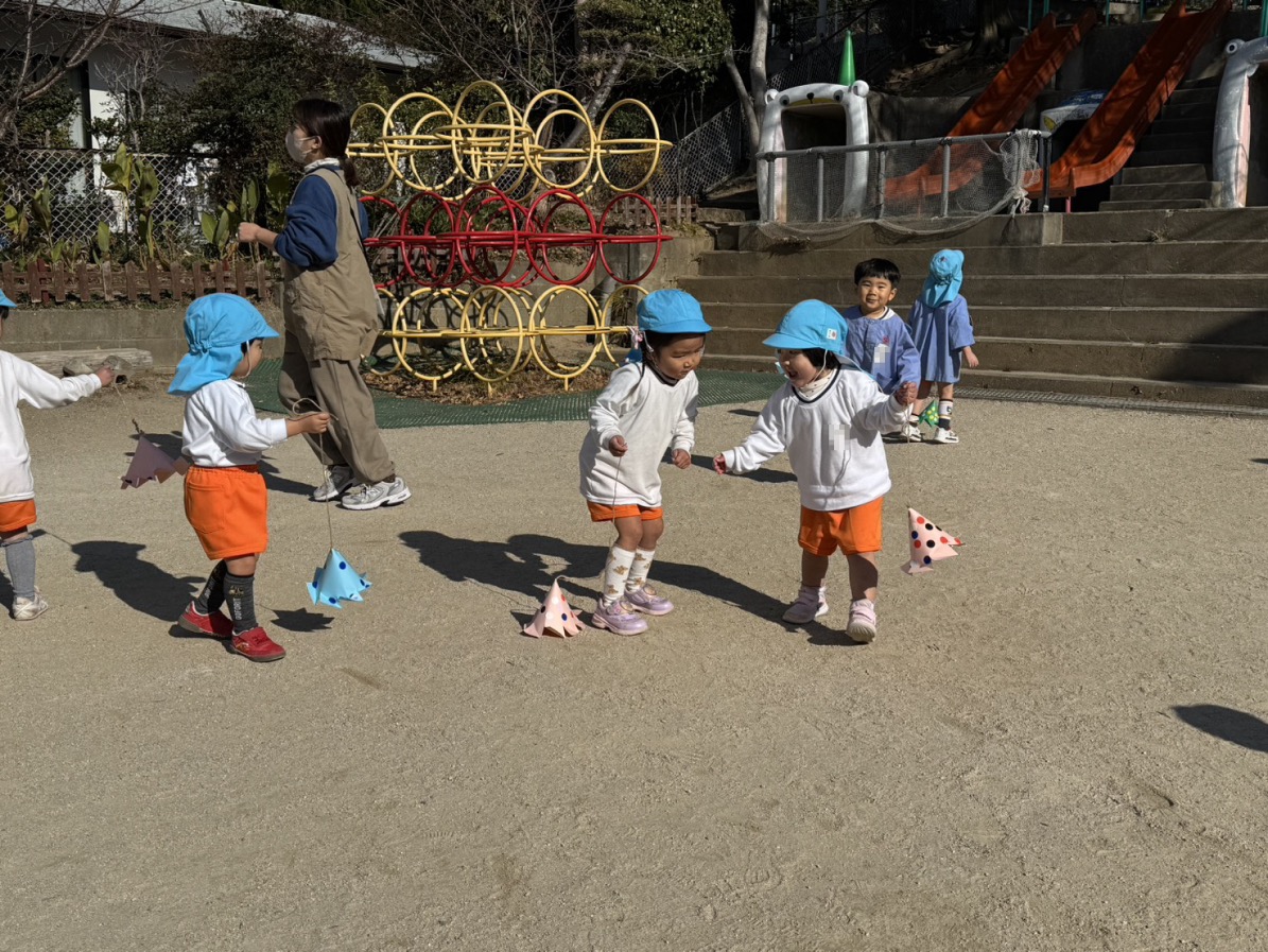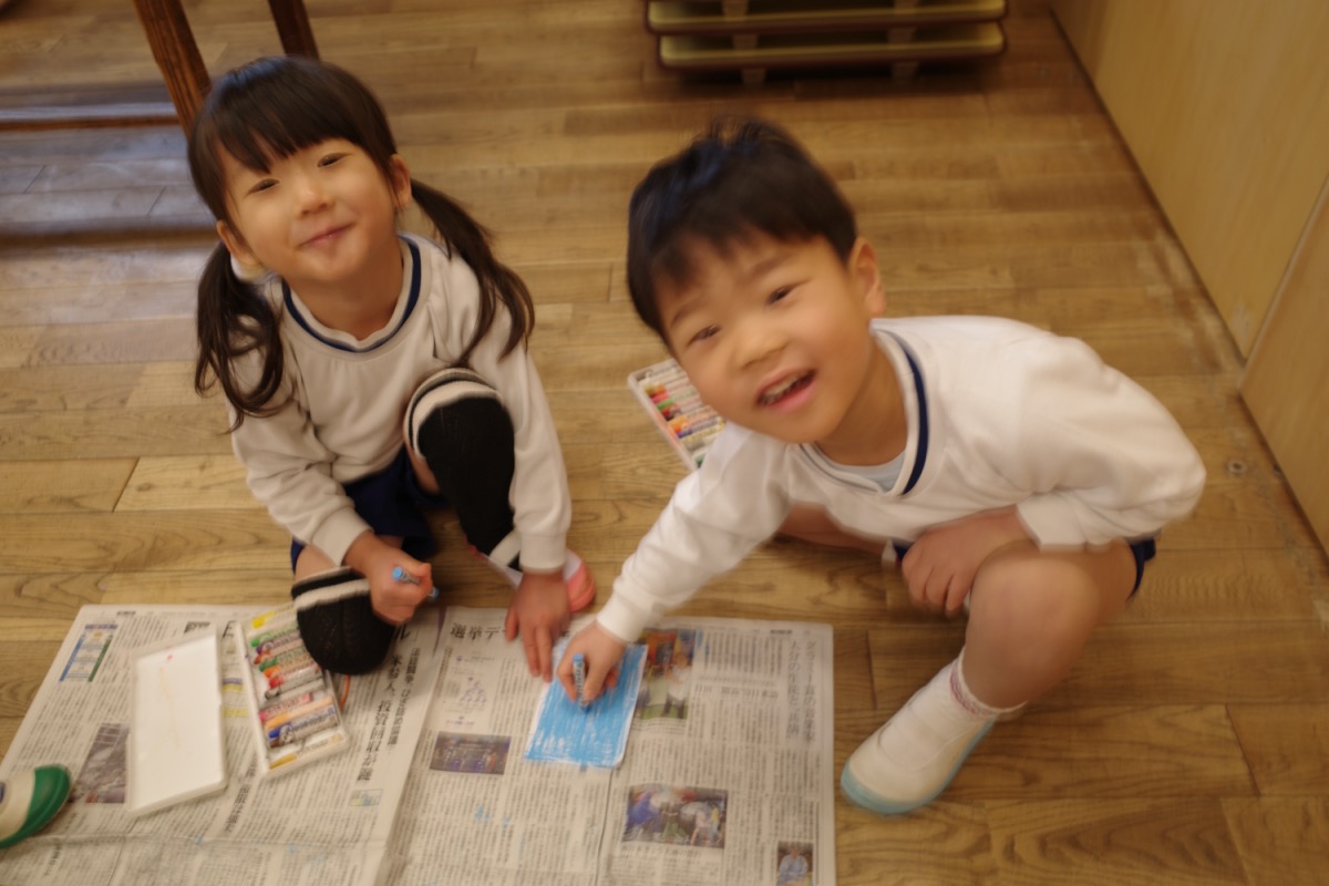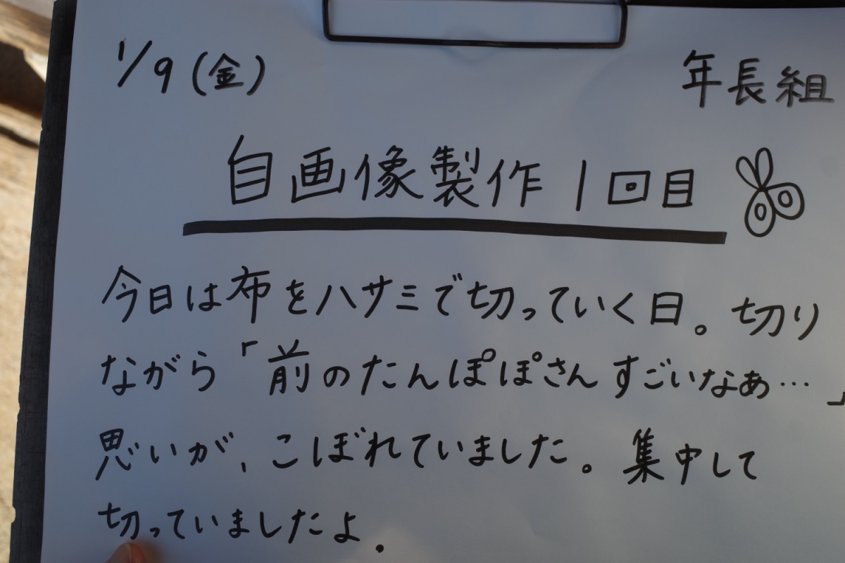 年少さんは、初めて自分たちでグループ名を決めるのですが、クレヨンの色から自分の好きな色を選び、どうやってみんなの意見を一つにまとめるのか、苦戦。時々先生のサポートを受けながら、少しずつ自分たちで。北風小僧かんたろうを歌ったりもしました。年長さんは、いよいよ自画像に布はりの準備。まずは、布を細かく切っていきます。金の色紙をじゃんけんでやりとりも、楽しそう。年中はバスごっこや病院ごっこ等。年少少さんは、くるくる回る凧をつくったり。園庭でもだるまさんがころんだをしたり、変わった形の積み木に挑戦したり。