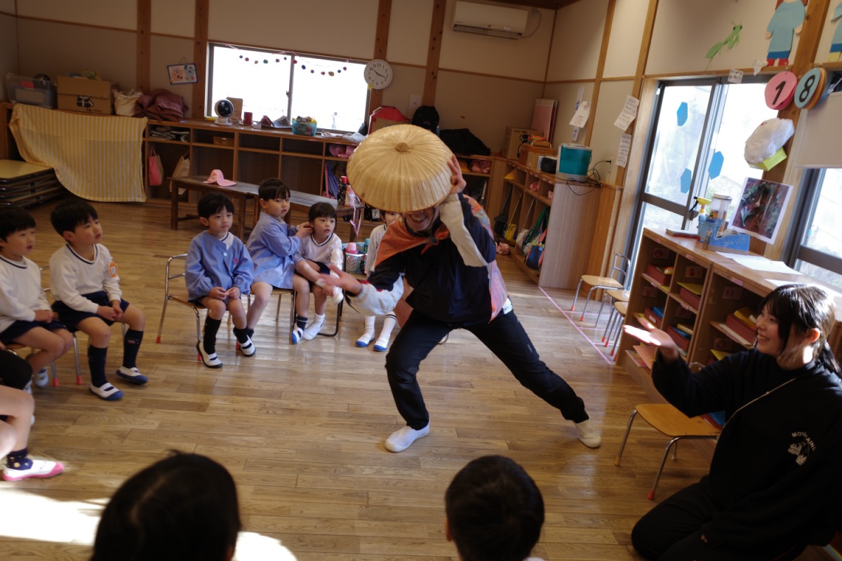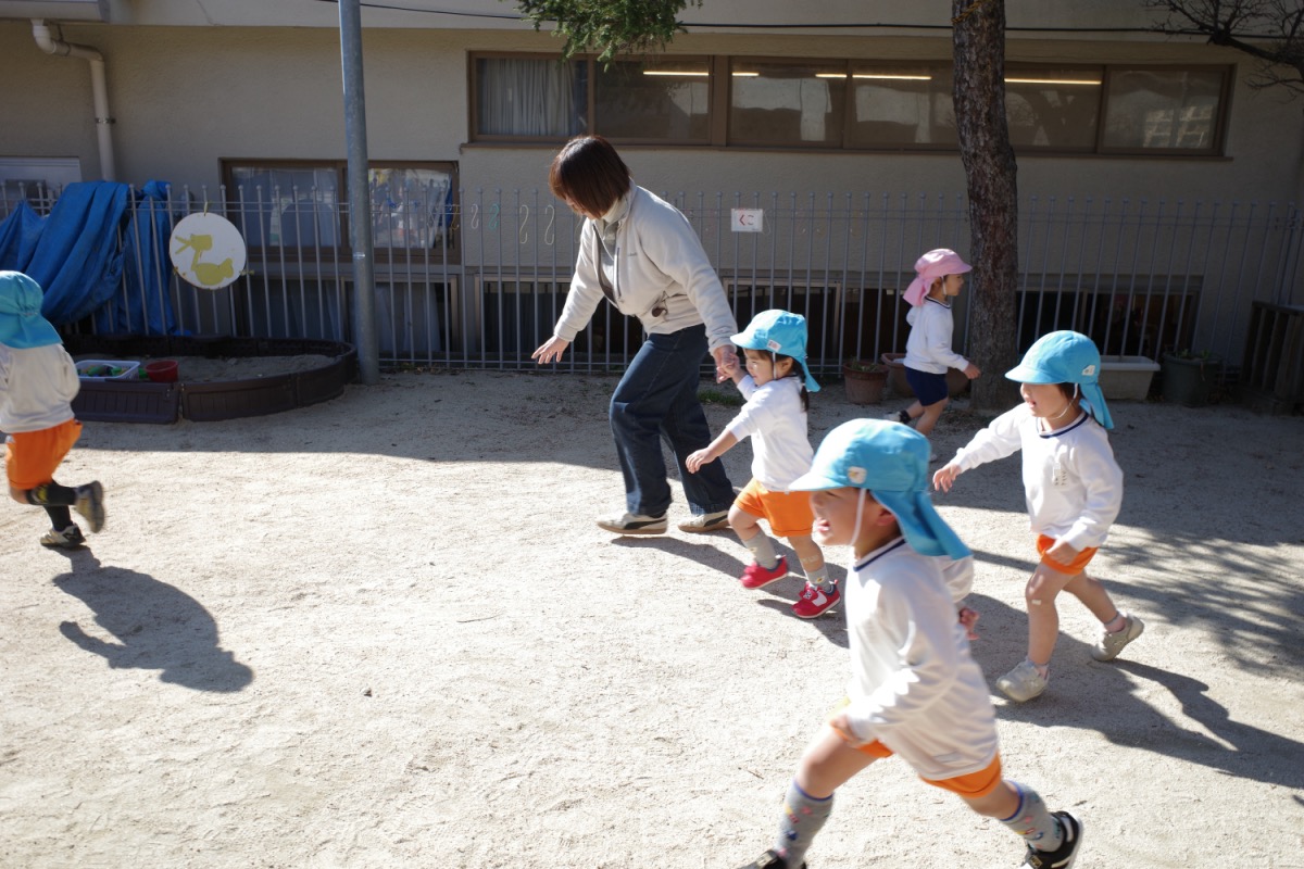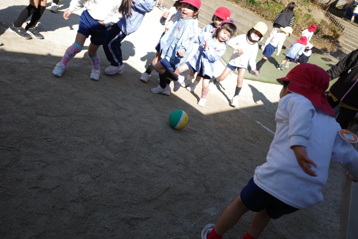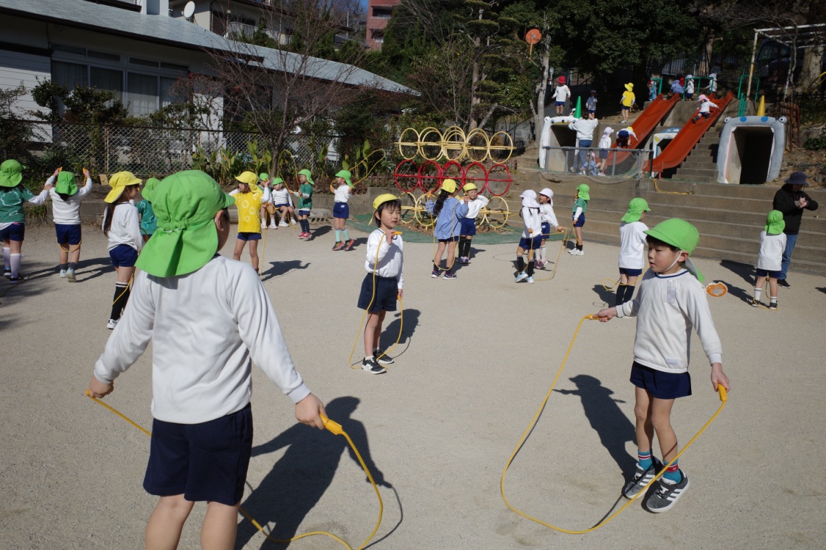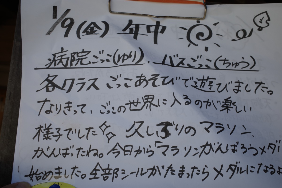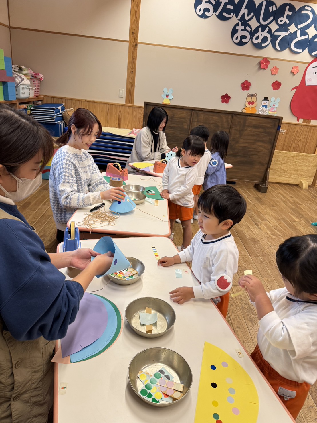 年少さんは、初めて自分たちでグループ名を決めるのですが、クレヨンの色から自分の好きな色を選び、どうやってみんなの意見を一つにまとめるのか、苦戦。時々先生のサポートを受けながら、少しずつ自分たちで。北風小僧かんたろうを歌ったりもしました。年長さんは、いよいよ自画像に布はりの準備。まずは、布を細かく切っていきます。金の色紙をじゃんけんでやりとりも、楽しそう。年中はバスごっこや病院ごっこ等。年少少さんは、くるくる回る凧をつくったり。園庭でもだるまさんがころんだをしたり、変わった形の積み木に挑戦したり。