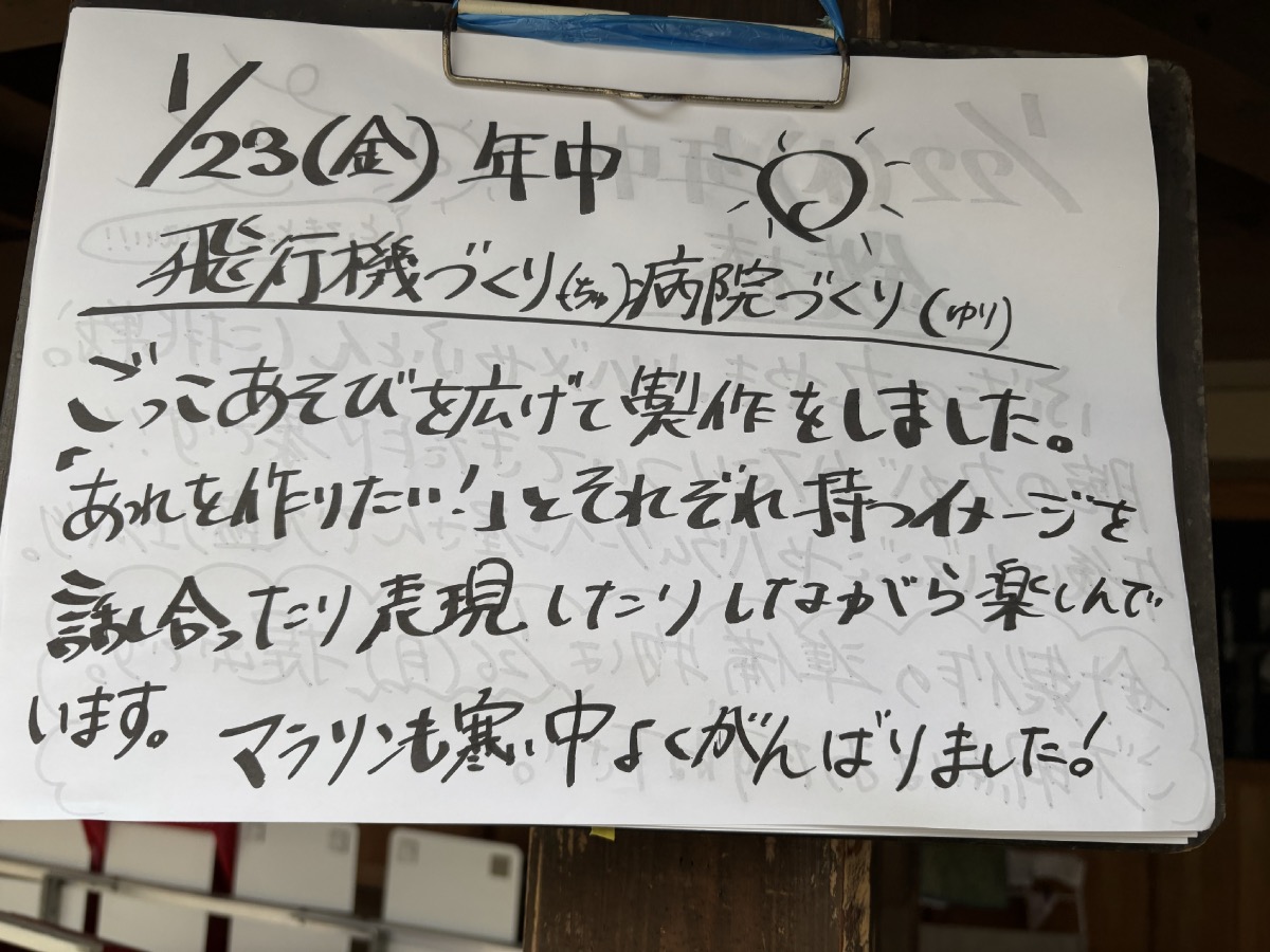 はしったり、つくったり、はなしあったり 01/23/2026 最終更新日時 : 01/23/2026 ozasa-admin [Show slideshow] 1 2 ► 朝からマラソン。年少少さんは、園庭を走ります。年少さんは、リズム体操。年中さんは、制作。年長さんは、卒園式ので話す”おもいで”について、年長さん合同で話し合い。どんな風にやったらよいか、園児達が一人一人考え、意見を出し合っていました。卒園に向けて成長為ている子ども達です。年長さんは、今日から親子作品展示が始まりました。 \ 最新情報をチェック / FacebookXBlueskyHatenaLINECopy