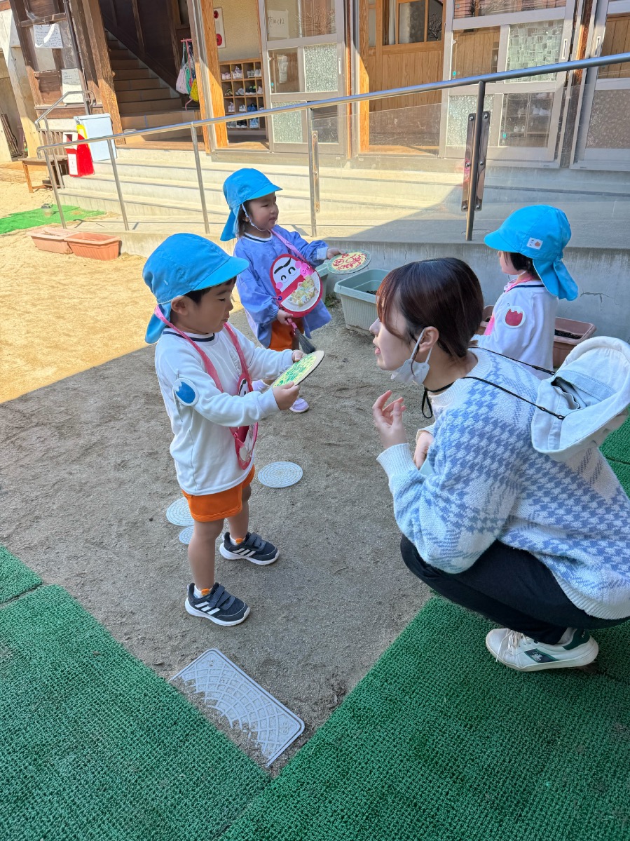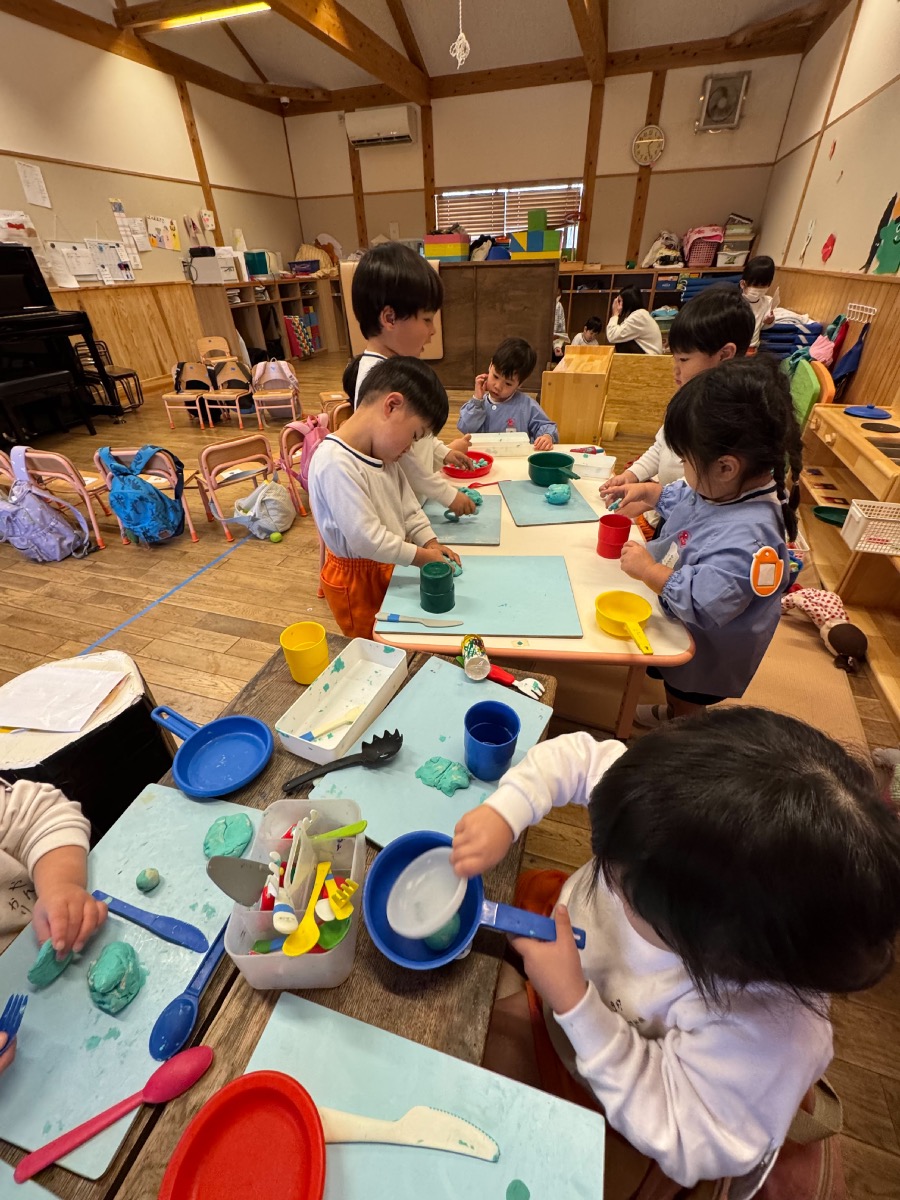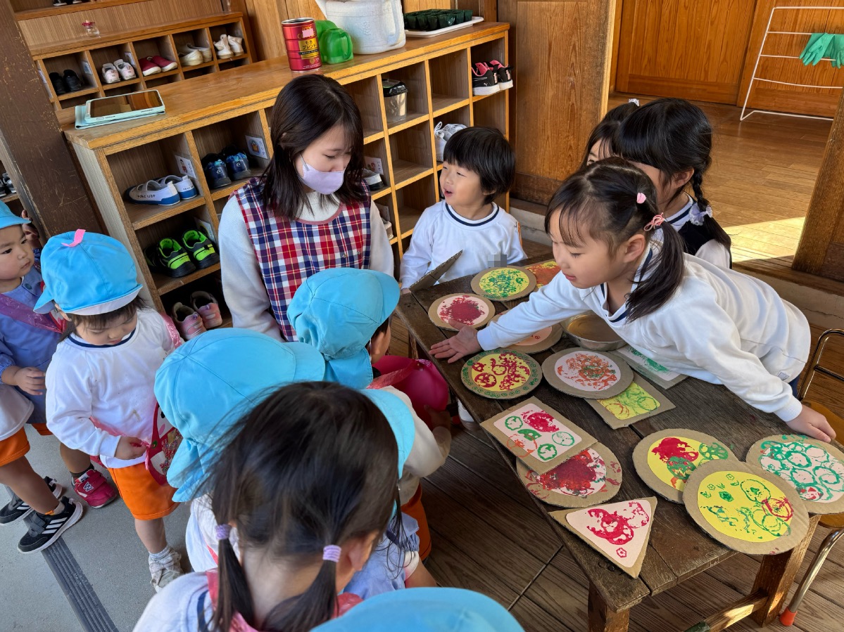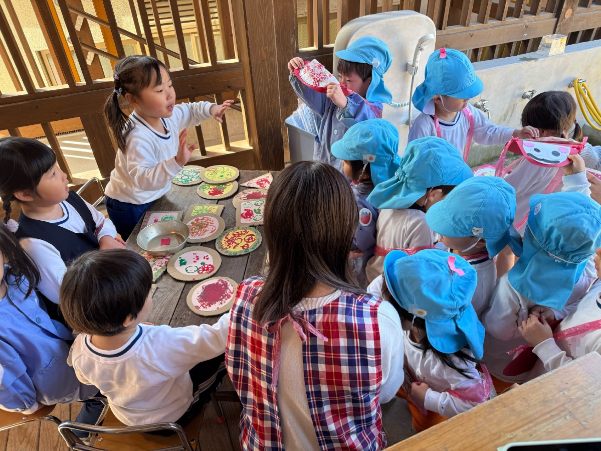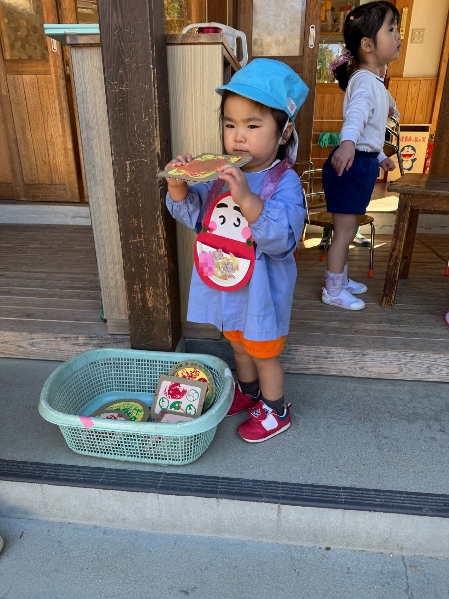 年少さんはピザやたこ焼きを。年中さんは何やら〇を描いて発展させます。年長さんは、自画像やら。年少少さんは、お客さんとして、だるまのお財布もってやってきました。