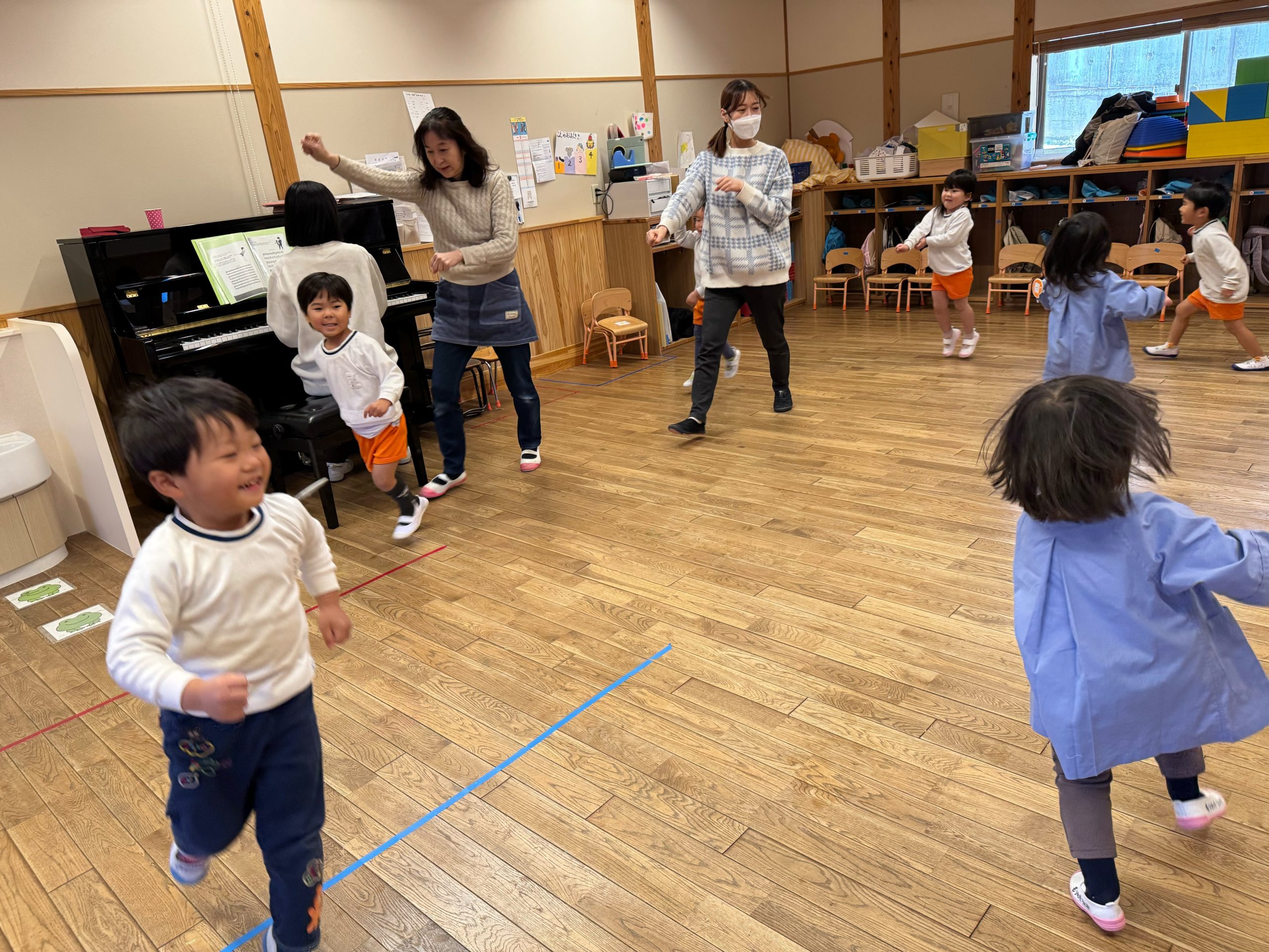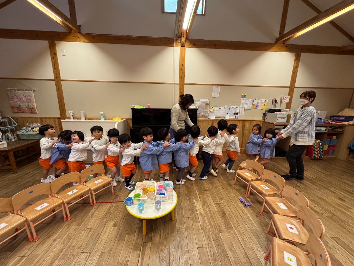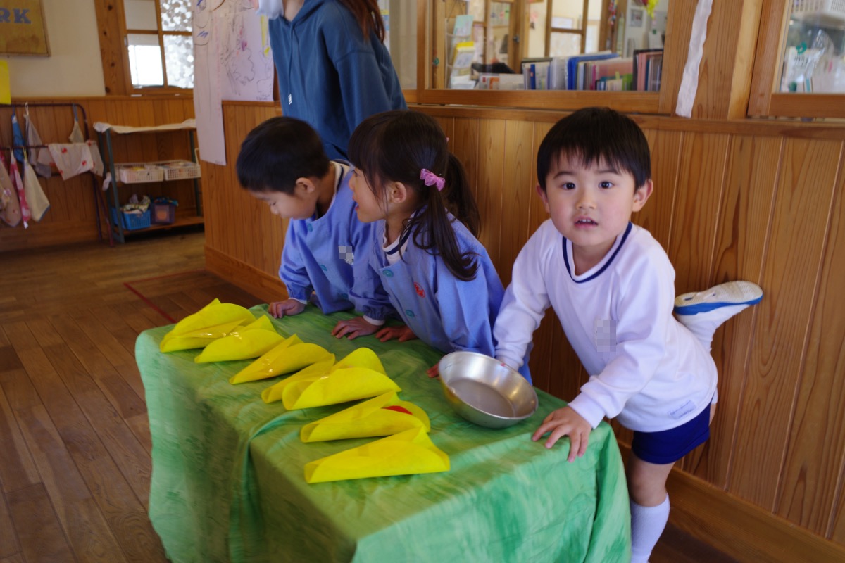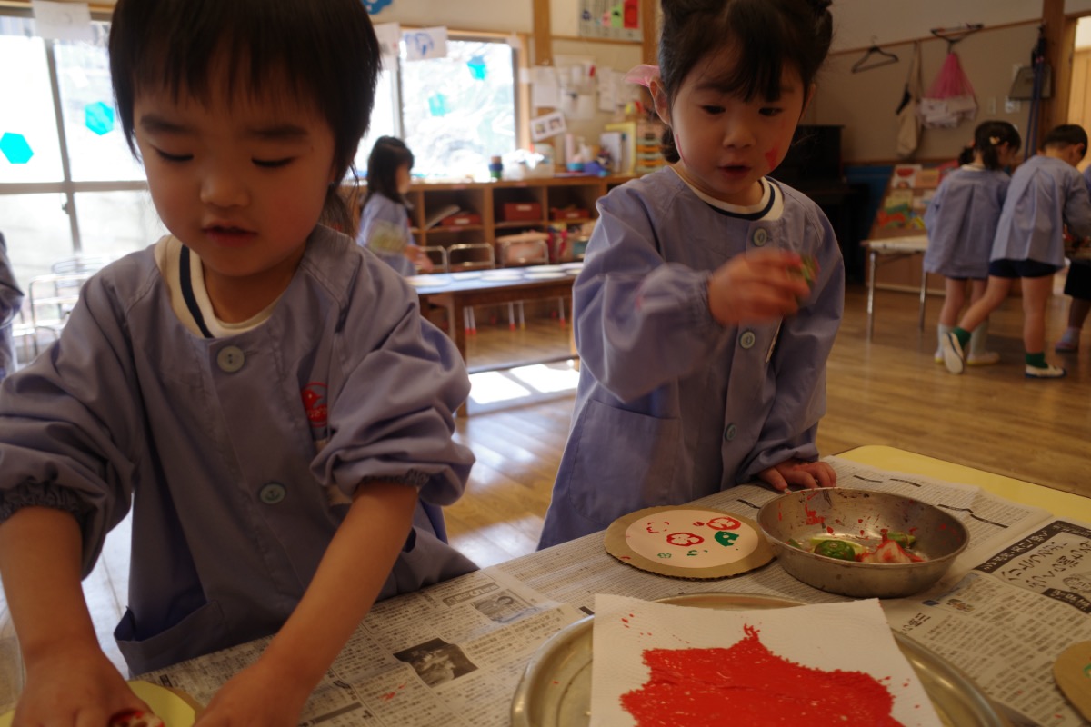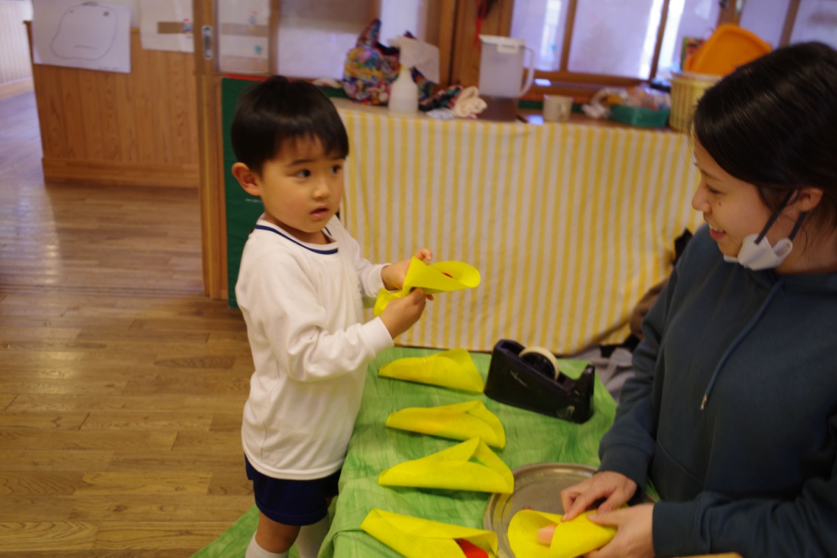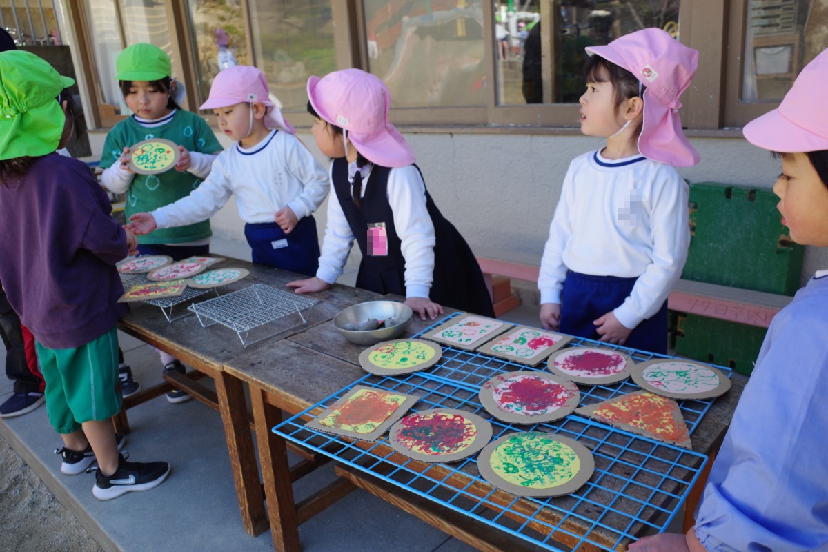 年少さんはピザやたこ焼きを。年中さんは何やら〇を描いて発展させます。年長さんは、自画像やら。年少少さんは、お客さんとして、だるまのお財布もってやってきました。