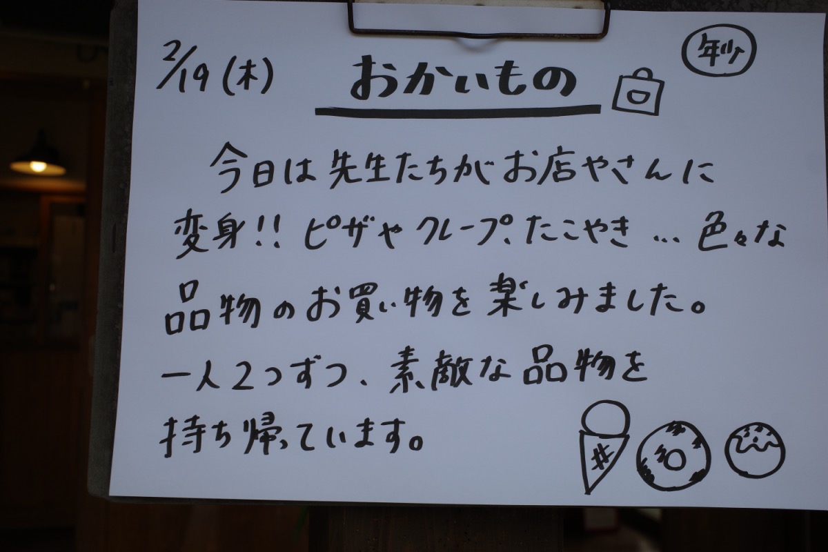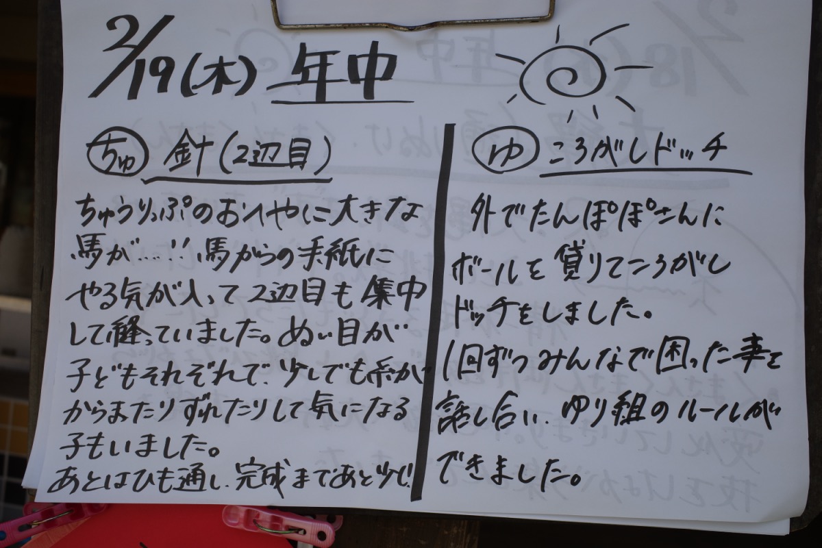 2月19日(木) 02/19/2026 最終更新日時 : 02/19/2026 ozasa-admin [Show slideshow] 年少さんは、お店屋さんを園庭で。お客さんのたんぽぽさん楽しそう。お昼には、マイ箸置きを。そして卒園式の練習も。年中さんは、ボールで朝遊んだり、裁縫したり。ばら組さんとひよこ組さんは、動物園に遠足。 \ 最新情報をチェック / FacebookXBlueskyHatenaLINECopy