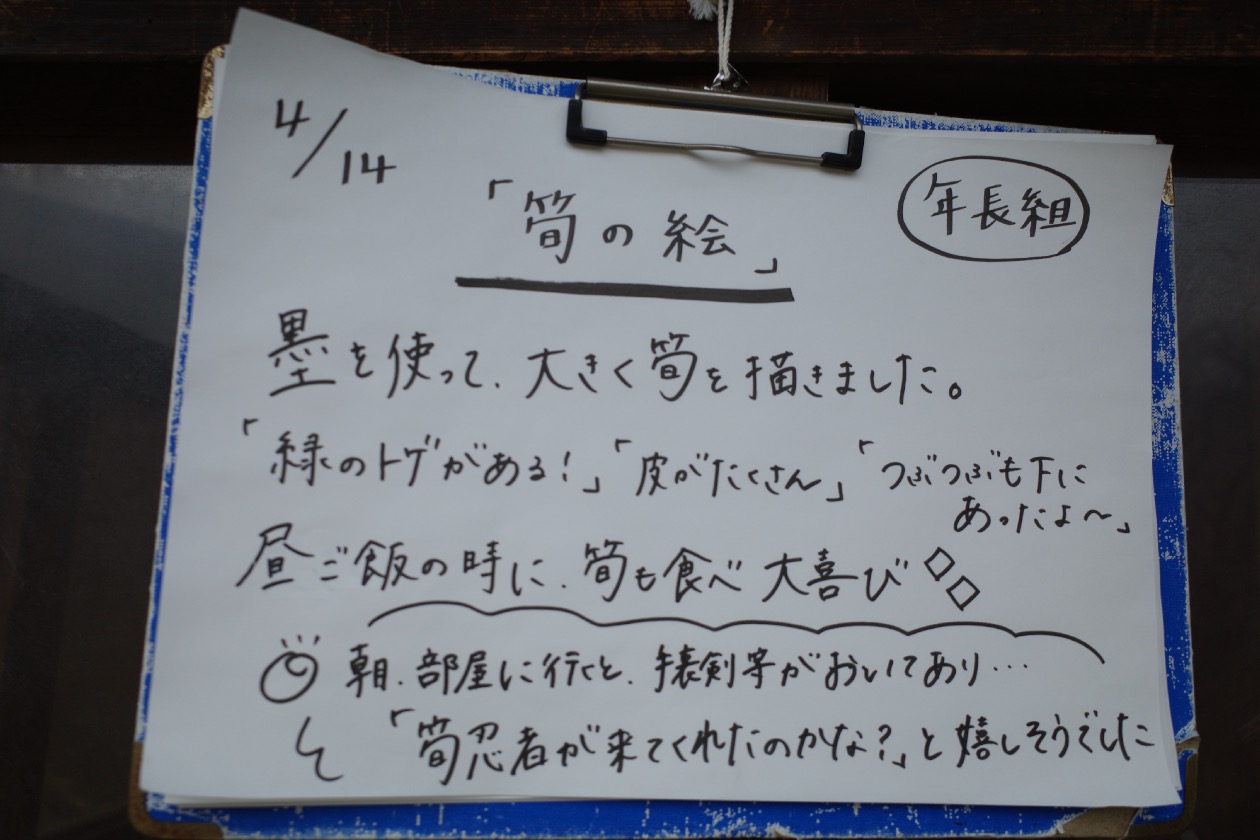 絵を描いたり、 04/14/2026 最終更新日時 : 04/14/2026 ozasa-admin [Show slideshow] 1 2 ► 年長さんは、昨日描いた竹の子を墨汁で描き、お昼には竹の子をいただきました。年中さんは、玉入れ?遊び。折り紙でびっくり箱もつくったり。年少さんは紙をつなげて、クレヨンで自由に。ばら組さんは、一人で帰りの準備に挑戦。 \ 最新情報をチェック / FacebookXBlueskyHatenaLINECopy
